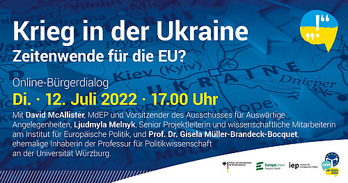 Wie kann die EU in der Sicherheits- und Verteidigungspolitik handlungsfähiger werden? Brauchen wir eine Reform der EU-Erweiterungspolitik? Darüber möchten wir mit Ihnen beim letzten digitalen Bürgerdialog vor der Sommerpause zum Thema "Krieg in der Ukraine: Zeitenwende für die EU?" sprechen. Schalten Sie sich ein und diskutieren Sie mit David McAllister, MdEP und Vorsitzender des Ausschusses für Auswärtige Angelegenheiten, Ljudmyla Melnyk, Senior Projektleiterin und wissenschaftliche Mitarbeiterin im Projekt "German-Ukrainian… » weiterlesen