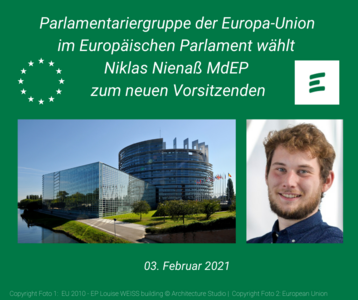 Am 03.02.2021 wählten die 63 Mitglieder der Europa-Union Parlamentariergruppe im Europäischen Parlament einen neuen Vorstand. Der neue Vorsitzende, der Abgeordnete Niklas Nienaß, kündigte eine enge Zusammenarbeit mit dem Brüsseler Verband der Europa-Union sowie mit dem Bundesverband der JEF an. Nienaß (Grüne) zur Seite stehen als Stellvertretende Vorsitzende Hildegard Bentele (CDU), Europa-Union Vizepräsidentin Gabriele Bischoff (SPD), der langjährige Europa-Union Landesvorsitzende Bayern Markus Ferber (CSU) und Andreas Glück (FDP). » weiterlesen