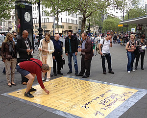 Wie kann Europa demokratischer werden? Dies war das Motto zweier Bodenzeitungen, die Aktive von Europa-Union und JEB am 9. Mai an zentralen Plätzen in Berlin zeigten. Am Ku’Damm und am Hackeschen Markt waren Passanten eingeladen, über Vorschläge für eine aktivere Demokratie auf europäischer Ebene abzustimmen. Die Aktion weckte viel Interesse bei Berlinern und internationalen Gästen und führte zu lebhaften Diskussionen über Europa.