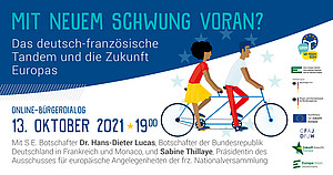 Wir laden Sie am 13. Oktober 2021, 19:00-20:30 Uhr, herzlich ein zu unserem simultan übersetzten deutsch-französischen Online-Bürgerdialog „Mit neuem Schwung voran? Das deutsch-französische Tandem und die Zukunft Europas“. Bringen Sie Ihre Anliegen und Fragen live ein und treten Sie auf Deutsch oder Französisch in den virtuellen Dialog mit: