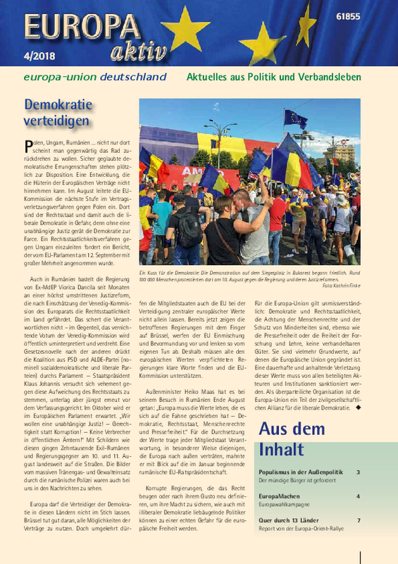 "Ich bin nicht hier, um mich zu rechtfertigen!" Das schleuderte die rumänische Regierungschefin jüngst dem Europäischen Parlament entgegen, als sie Auskunft geben sollte zu den fragwürdigen Justizreformen in ihrem Land. Der Ton wird rauher. Nicht nur Ungarn und Polen, auch Rumänien droht ein Rechtsstaatlichkeitsverfahren. Um Europas Demokratie und Rechtsstaatlichkeit zu verteidigen braucht es mutige Hüter der Verträge - und es braucht uns alle. Ob Europa seine eigenen Werte in der Flüchtlingspolitik verrät, das ist ebenso Thema der neuen Europa-Aktiv wie der neuerdings salonfähige Populismus in der Außenpolitik. Wie immer berichten die Landesverbände von ihren Aktivitäten. Lesen Sie auch, was in der Kampagne zur Europawahl geplant ist und was die Männer und Frauen auf der "Europa-Orient-Rallye" zwischen dem Elsass und der jordanischen Wüste erlebt haben.