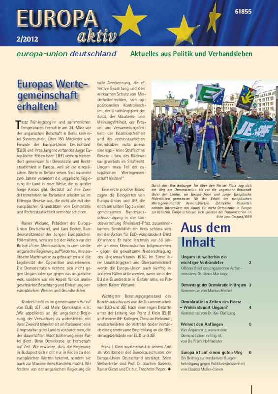 Neuigkeiten aus dem Verband und über Europa lesen Sie in der aktuellen Ausgabe unserer Mitgliederzeitschrift Europa aktiv. Dort finden Sie u.a. einen Bericht zu unserer Demonstration vor der Botschaft Ungarns in Berlin, einen offenen Brief des ungarischen Außenministers, einen Aufruf des Bundesverbandes zur Beteiligung an der Europa-Woche sowie viele weitere Kommentare, Beiträge und Berichte aus den Landes-, Kreis-, Stadt- und Ortsverbänden der Europa-Union Deutschland.
