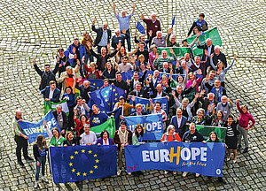 Wie wir unsere Botschaften zu den Menschen bringen, darum ging es in drei Workshops. Der Workshop zur Öffentlichkeitsarbeit behandelte erfolgreiche Strategien für die Veranstaltungsbewerbung, Pressearbeit und den Einsatz von Social Media für die gemeinsame Europawahl-Kampagne. Im Workshop „Demokratie verteidigen“ mit Expertinnen von „Kleiner Fünf“ wurde „radikal höfliches“ Argumentieren gegen EU- und Demokratiefeindlichkeit vorgestellt. Bei den anstehenden Infoständen im Vorfeld der Wahl können diese Techniken und Herangehensweisen direkt zum Einsatz kommen. Wie man attraktive Infostände und Straßenaktionen gestalten kann, probierten die Delegierten beim EurHope-Kreativworkshop aus. Neben dem Publikumsmagneten Glücksrad wurden auch der Blickfang − die „Mauer der Klischees − vorgestellt, der EurHope-Bilderrahmen für Selfies und die EU-Herzkranzund EurHope-Schablonen für Textil- und Straßenbemalung. Daneben bestand das Angebot, verschiedene Gesprächssituationen am Infostand auszuprobieren.