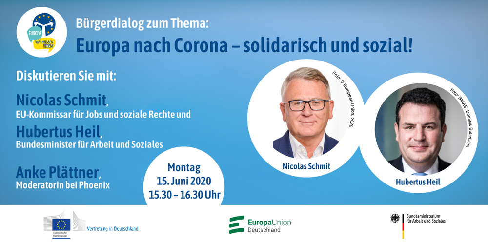 Europa nach Corona – solidarisch und sozial! Online Bürgerdialog mit Nicolas Schmit, EU-Kommissar für Jobs und soziale Rechte und Hubertus Heil, Bundesminister für Arbeit und Soziales