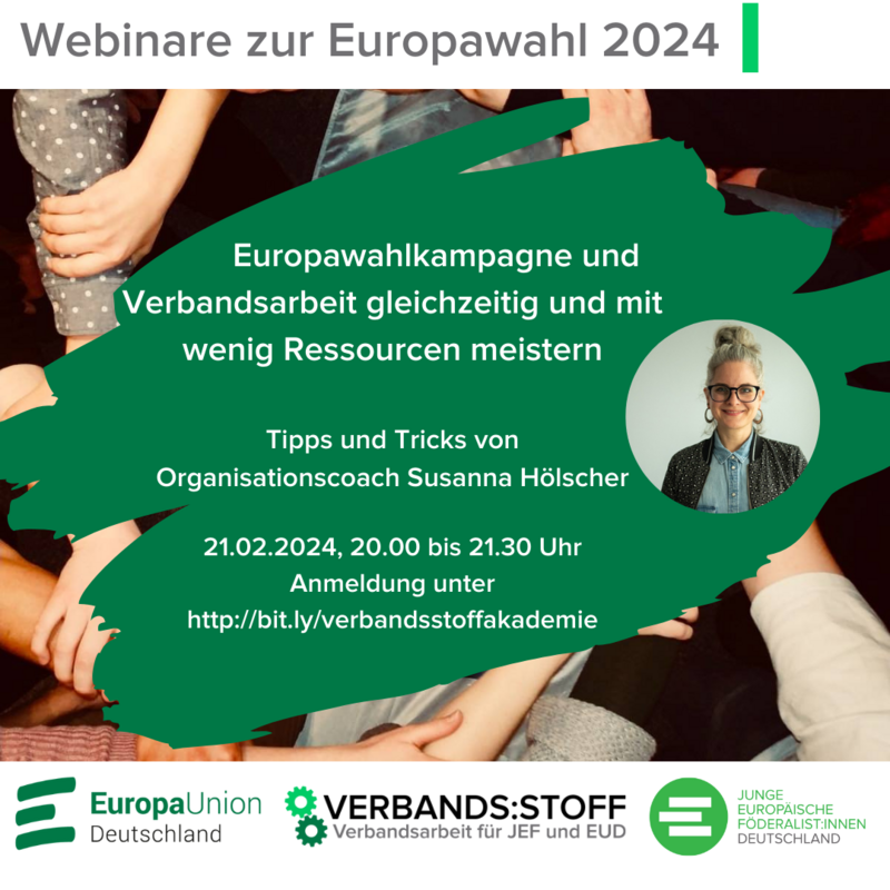 Susanna Hölscher von der Akademie für Ehrenamtlichkeit wird als Expertin bewährte und ganz konkrete Tipps und Tricks teilen, wie Prioritäten für das eigene Engagement herausgearbeitet und Ressourcen zielgerichtet eingesetzt werden können. Nur als Beispiel: Welche Aufgaben der Verbandsarbeit können für die Zeit der Europawahlkampagne hinten anstehen? Wie gelingt es, die eigenen Kampagnenaktivitäten so auszurichten, dass durch die Europawahlkampagne nicht nur Wählerinnen und Wähler erreicht, sondern auch neue begeisterte Mitstreiterinnen und Mitstreiter gewonnen werden können?