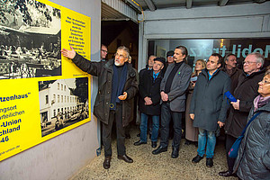 EUD-Kreisvorsitzender Gerhard Thiel stellt die Gedenktafel am Gründungsort, dem ehemaligen Hotel „Schützenhaus“ vor. Foto: Hans-Jürgen Dehn