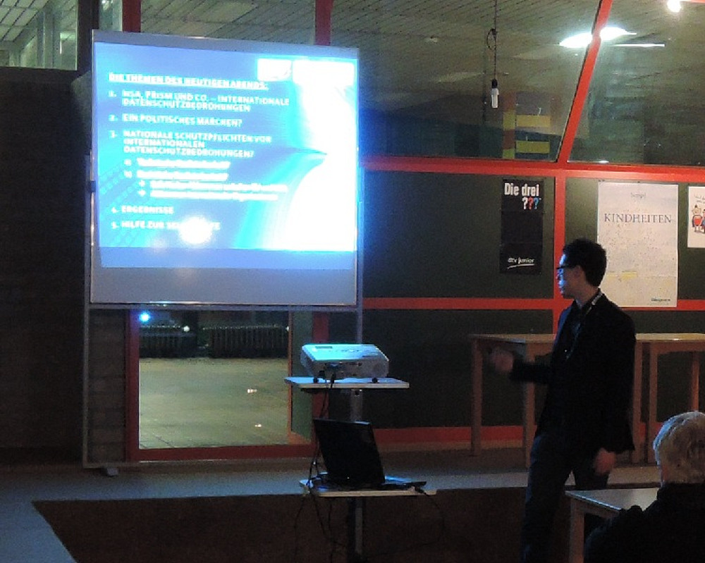 Der Rechtswissenschaftler Dennis-Kenji Kipker vom Bremer Forschungsinstitut für Informations-, Gesundheits- und Medizinrecht (IGMR) referierte zu dieser Thematik am Montag, den 24.02.2014 ab 19:30 Uhr im kleinen Forum der KGS Leeste für die Europa-Union im Landkreis Diepholz und ging auf alle die vorgenannte Problematik betreffenden wesentlichen Fragestellungen ein, im Anschluss fand eine lebhafte Diskussion statt. Dennis-Kenji Kipker studierte von 2006-2011 an der Universität Bremen Rechtswissenschaften und promoviert seit 2012 im Polizei- und Nachrichtendienstrecht mit europarechtlichen und internationalen Bezügen.
