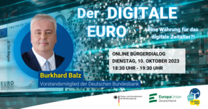 Diese und weitere Fragen möchten wir gerne mit Ihnen in unserem nächsten Online-Bürgerdialog „Der Digitale Euro – Eine Währung für das digitale Zeitalter?!“ am 10. Oktober 2023 von 18:30 Uhr bis 19:30 Uhr diskutieren. Wir freuen uns sehr, Bundesbankvorstand Burkhard Balz als Experten für diese exklusive Online-Fragestunde gewonnen zu haben. Bringen Sie Ihre Fragen und Anliegen ein und hören Sie aus erster Hand, was die Bundesbank und die Europäische Zentralbank zum digitalen Euro planen.