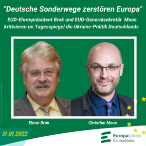 In einem Gastbeitrag für den Tagesspiegel kritisierten EUD-Ehrenpräsident Brok und EUD-Generalsekretär Moos die Ukraine-Politik Deutschlands: „Deutsche Eliten zeigen Verständnis für vermeintlich berechtigte russische Sicherheitsanliegen. Für die Lösung der Ukraine-Krise ist das fatal.“ Deutschlands Verbündete fragten sich zu Recht, ob das Land noch einen klaren Kompass habe.