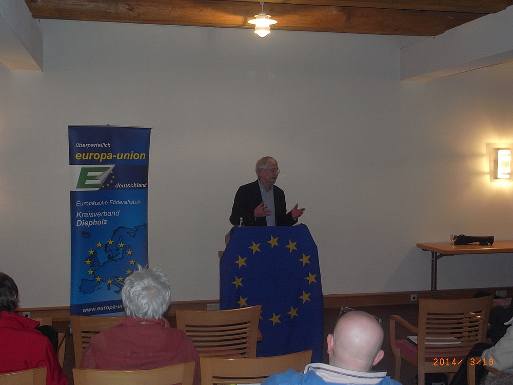 Der Vorsitzende der Europa-Union im Landkreis Diepholz Gerhard Thiel begrüßt die interessierten Bürgerinnen und Bürger.